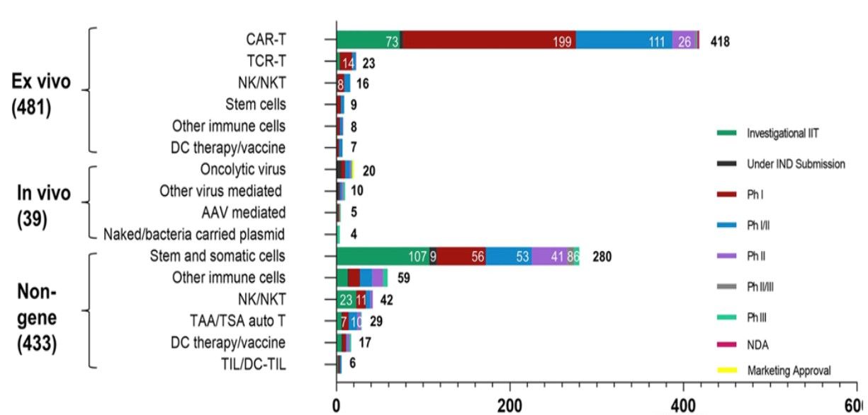 据公开数据显示,全球CGT大多数处于早期研发阶段(包括临床前研究和临床Ⅰ期),CGT市场处于萌芽期。我国开展的CGT临床试验数量目前位居全球第二,临床开发热情高涨。为进一步拓展这个领域,国家从十三五到十四五期间出台了很多政策与CGT相关的治疗原则,旨在加快产业发展。