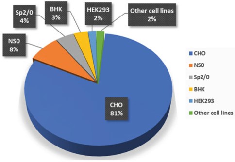 CHO细胞是最常用的宿主细胞,从1987 年到2021年2月,通过培养的哺乳动物细胞生产的获批生物药中有 81% 是使用CHO细胞生产。