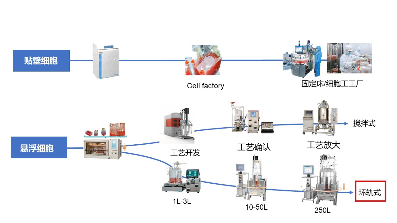 上游工艺平台的选择策略,需要从技术层面(递送系统、宿主细胞类型等)以及非技术层面(项目阶段、目的以及法规、商业价值等)考虑。以病毒载体为例,除固定床反应器/细胞工厂以及搅拌式细胞培养以外,高腾生物的放大工艺亮点在于环轨式悬浮细胞培养技术,最大体积培养可高达2500L,可减少搅拌式培养带来的剪切力,适应范围广。