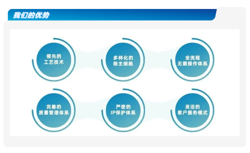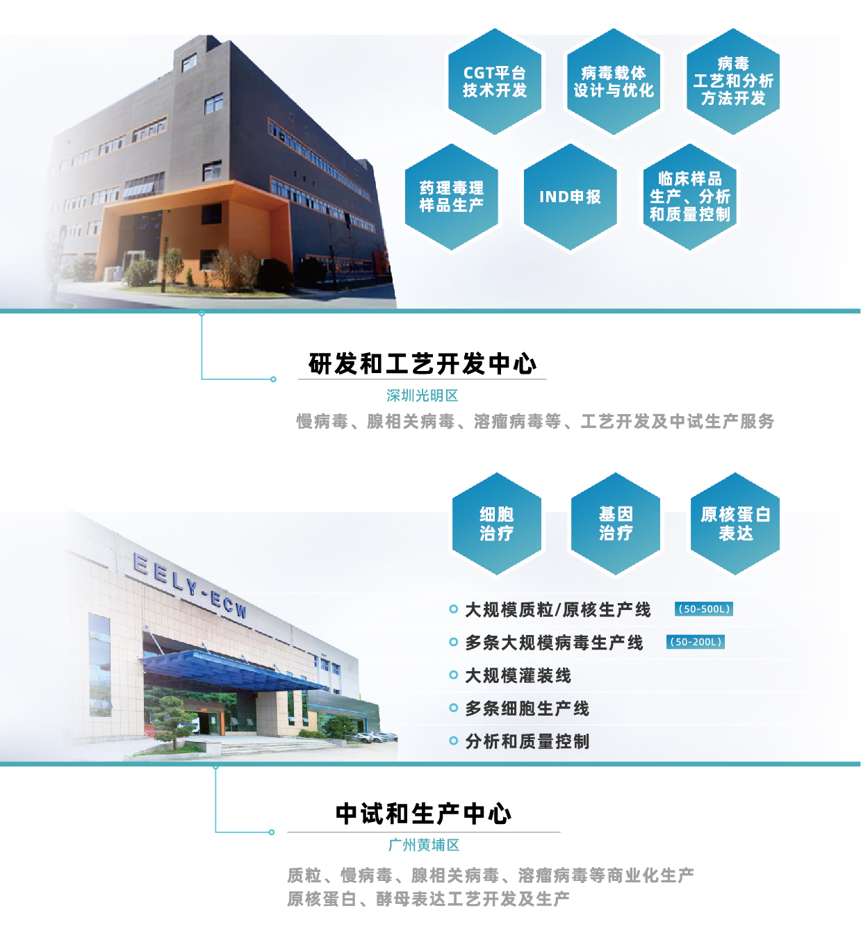 目前有深圳光明区研发和工艺开发中心和广州黄埔区中试和生产中心两大基地。基地建设基于QbD理念设计,具备符合国际标准的cGMP生产设施,独立的GMP生产线,全封闭系统,有效防止批间交叉污染;另外,产能布局灵活,满足不同IND到BLA到商业化规模的生产。