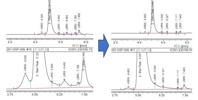 汉腾生物工艺平台纯化步骤中去除高分子量和低分子量的前后对比