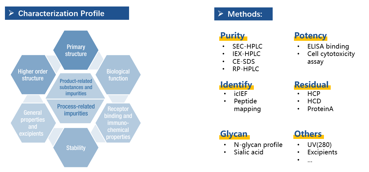 在药学特性可比性研究中,汉腾生物拥有丰富的经验,可提供完整的药学相似性评价服务,包括原研药的产地、批次和相似性评价。针对相似性评价,可提供一系列方法开发、确认和验证服务,涵盖一级结构、高级结构、翻译后修饰、糖基化修饰、电荷异质性、分子大小异质性、生物活性、免疫学特征等方面。