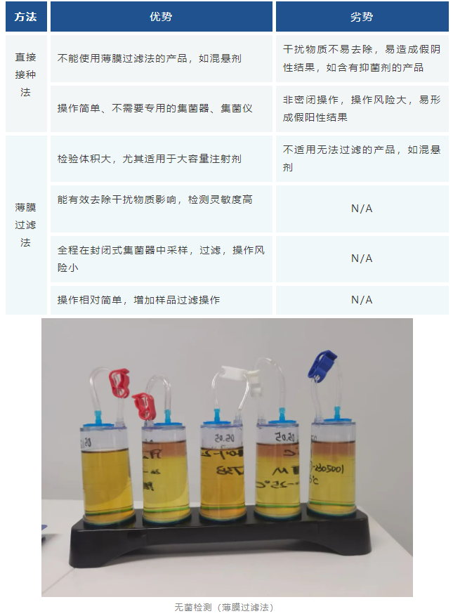 无菌检测的方法主要包括直接接种法和薄膜过滤法两种:
