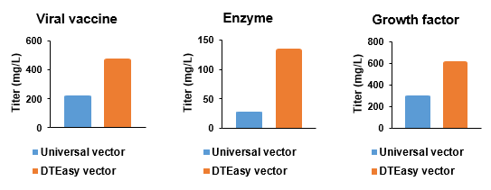 对于培养过程中对细胞产生一定压力的蛋白,通过添加剂增加细胞耐受也可以提升表达量。DTEasy专有添加剂可只需在培养过程中简单的单次添加,即可最高提升3倍表达量。